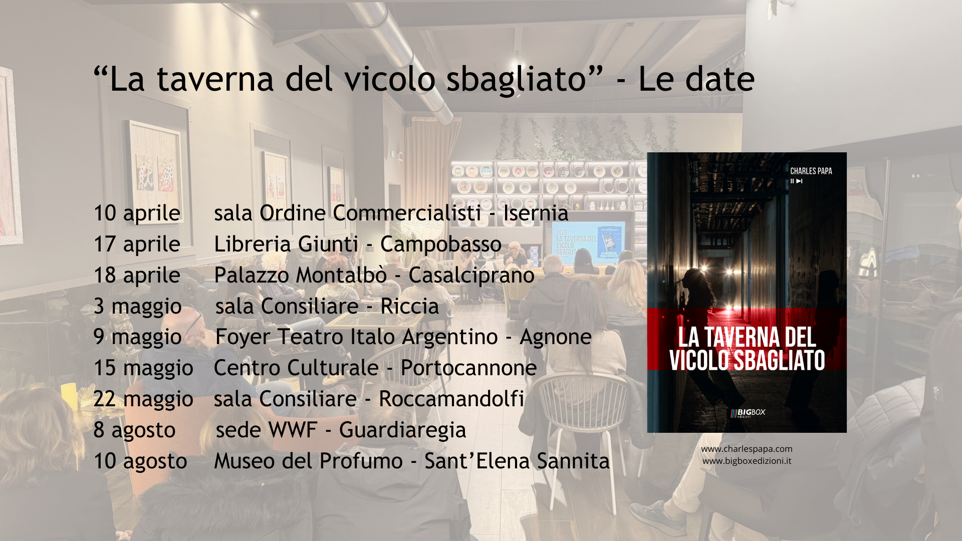 Tre libri pubblicati con BigBox Edizioni, il terzo romanzo uscito il 16 gennaio è "La taverna del vicolo sbagliato".